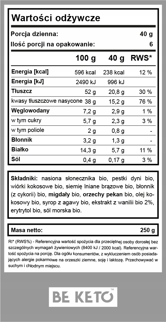 BIO Keto Granola o smaku Francuskiej Wanilii to prawdopodobnie najlepsza keto granola na świecie! Stworzona z myślą o miłośnikach wyrafinowanych smaków na diecie ketogenicznej i niskowęglowodanowej. Organiczne składniki najwyższej jakości, starannie wyselekcjonowane orzechy i nasiona, wzbogacone nutą wanilii. Każda porcja (40g) dostarcza idealnych proporcji zdrowych tłuszczów (20,8g) i białka (5,7g), przy minimalnej zawartości węglowodanów (2,9g). Chrupiąca, aromatyczna i niesamowicie sycąca – zaspokoi Twój głód i ochotę na subtelną słodycz bez ryzyka wypadnięcia z ketozy! Propozycja spożycia: Jako śniadanie – połącz z mlekiem roślinnym lub jogurtem kokosowym dla pełnowartościowego, sycącego posiłku. Jako przekąska – spożywaj 40g granoli między posiłkami, by zaspokoić głód i uzupełnić energię. Jako baza do deserów – wykorzystaj do przygotowania eleganckich keto deserów lub jako dodatek do lodów.
