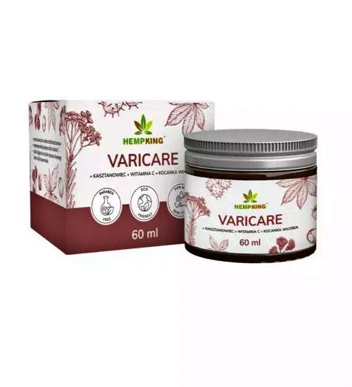Varicare – naturalne wsparcie w walce z popękanymi naczynkami Varicare – jak działa maść na naczynka? Naturalne składniki aktywne w maści Varicare tworzą wyjątkową formułę, która w bezpieczny sposób wesprze Twoją walkę z popękanymi naczynkami skóry. Jak działa maść na naczynka? Dzięki kasztanowcowi: zwiększa odporność skóry na rozszerzanie się naczynek i ich pękanie, wzmacnia skórę poprzez działanie na naczynia krwionośne, wspomaga walkę z uczuciem ciężkich nóg, Dzięki kocance włoskiej: działa ściągająco na naczynka skórne, przywraca równowagę skórze, zmniejsza zaczerwienienia i łagodzi podrażnienia, pielęgnuje skórę naczynkową, rozjaśnia i nawilża skórę wspomaga skórę poprzez produkcję kolagenu, wspiera wygląd skóry poprzez działanie na naczynia krwionośne. Maść zawiera również inne cenne składniki wprost z natury! Mowa między innymi o maśle shea oraz z orzechów kakaowca, olejach: migdałowym, oliwkowym i konopnym, a także o ekstrakcie konopnym z pełnym spektrum fitoskładników! To te składniki sprawiają, że maść działa na skórę, pielęgnuje ją. Dzięki swojej konsystencji świetnie się rozprowadza! Varicare – dla kogo? Maść Varicare jest przeznaczona dla każdego kto: potrzebuje wsparcia w dbaniu o skórę problematyczną, cierpi z powodu rozszerzonych i popękanych naczynek na skórze, ma skłonności do pękania naczynek, walczy z zaczerwienioną skórą, odczuwa potrzebę dbania o swoją skórę naturalnie! Sięgając po maść Varicare zadbasz o wzmocnienie skóry, poprzez działanie na popękane i rozszerzone naczynka oraz przywrócisz skórze zdrowy blask. Varicare – dlaczego warto sięgnąć po maść na naczynka od Hempking? Najważniejszym wyróżnikiem maści jest jej skład pełen naturalnych komponentów, w którym nie znajdziesz parabenów. Parabeny są konserwantami zawartymi w wielu kosmetykach. Jednak w naszych produktach stawiamy przede wszystkim na naturę! Maść na naczynka Varicare jest utrzymana w duchu zero waste. Zamknęliśmy ją w szklanym słoiczku o pojemności 60ml, z nakrętką z aluminium. Ekologia jest nam niezwykle ważna! Wykorzystujemy z natury to co najlepsze, a w zamian staramy się zadbać o przyrodę, która tyle nam od siebie daje. Maść Varicare na pękające naczynka to coś więcej niż tylko bezpieczny produkt. To kosmetyk, dzięki któremu pokochasz naturalną pielęgnację! Varicare – sposób użycia Maść Varicare w niewielkich ilościach rozsmaruj na skórze w miejscu popękanych lub rozszerzonych naczynek. Maść Varicare sprawdzi się zarówno na skórę twarzy, jak i w miejscach obrzęku skóry i popękanych naczynek na nogach, gdzie skóra jest o wiele grubsza. Należy przechowywać w suchym miejscu, w temperaturze pokojowej do 25 stopni Celsjusza. Varicare – skład INCI Aqua, Butyrospermum Parkii Butter, Capric/Caprylic Triglyceride, Glycerin, Prunus Amygdalus Dulcis Oil, Olea Europaea Husk Oil and Olea Europaea Fruit Oil, Ascorbic Acid, Aesculus Hippocastanum Seed Extract, Helianthus Annuus Seed Oil, Glyceryl Stearate Citrate, Glyceryl Stearate SE, Ruscus Aculeatus Root Extract, Ricinus Communis Seed Oil, Helichrysum Italicum Flower Water, Theobroma Cacao Seed Butter, Arnica Montana Flower Extract, Cetyl Alcohol, Cannabis Sativa Seed Oil, Cannabis Sativa Seed Extract, Citrus Sinensis Oil, Benzyl Alcohol, Citrus Paradisi Peel Oil, Xanthan Gum, Citrus Limonum Oil, Dehydroacetic Acid, Citric Acid, Limonene*, Linalool*, Citral* *składnik kompozycji zapachowej.