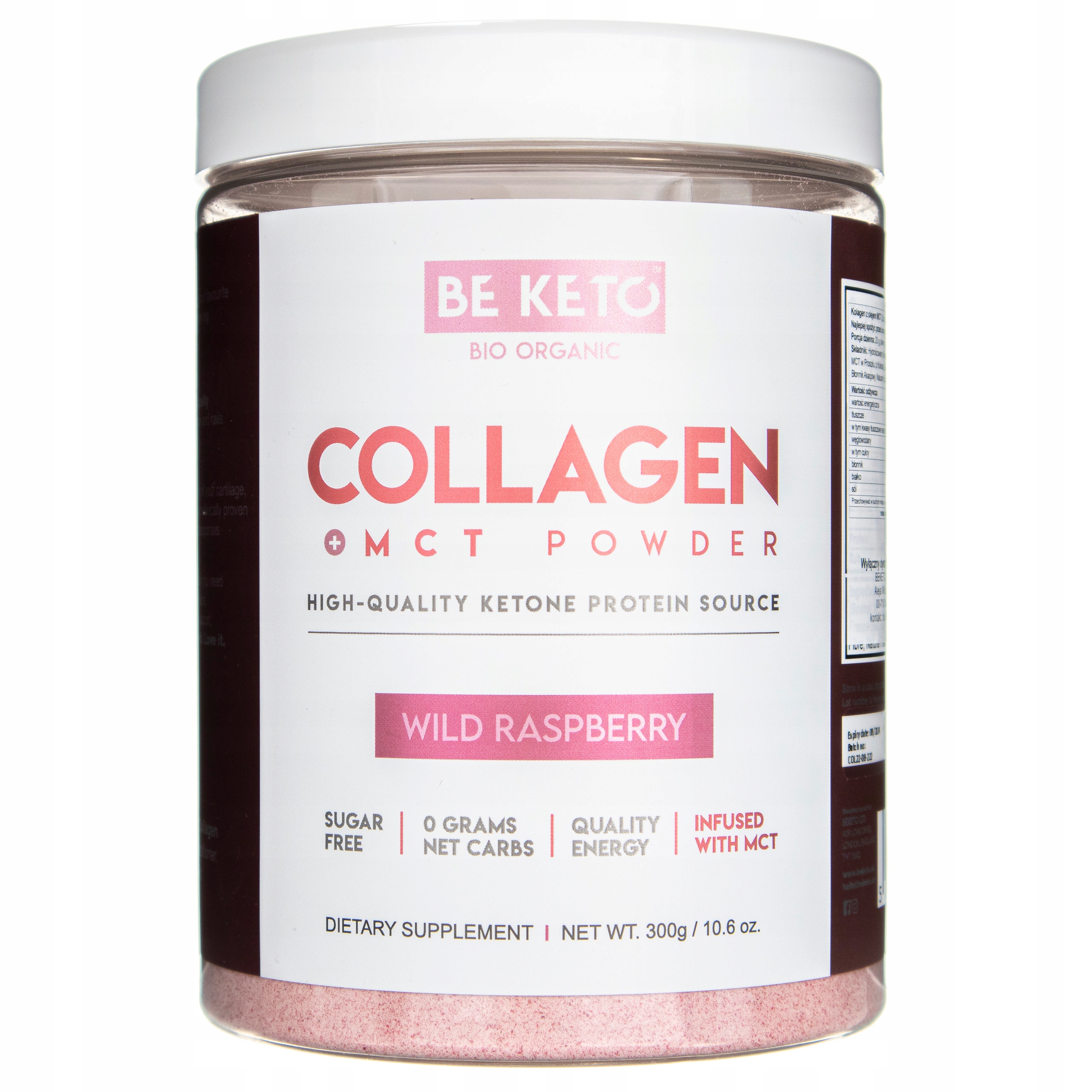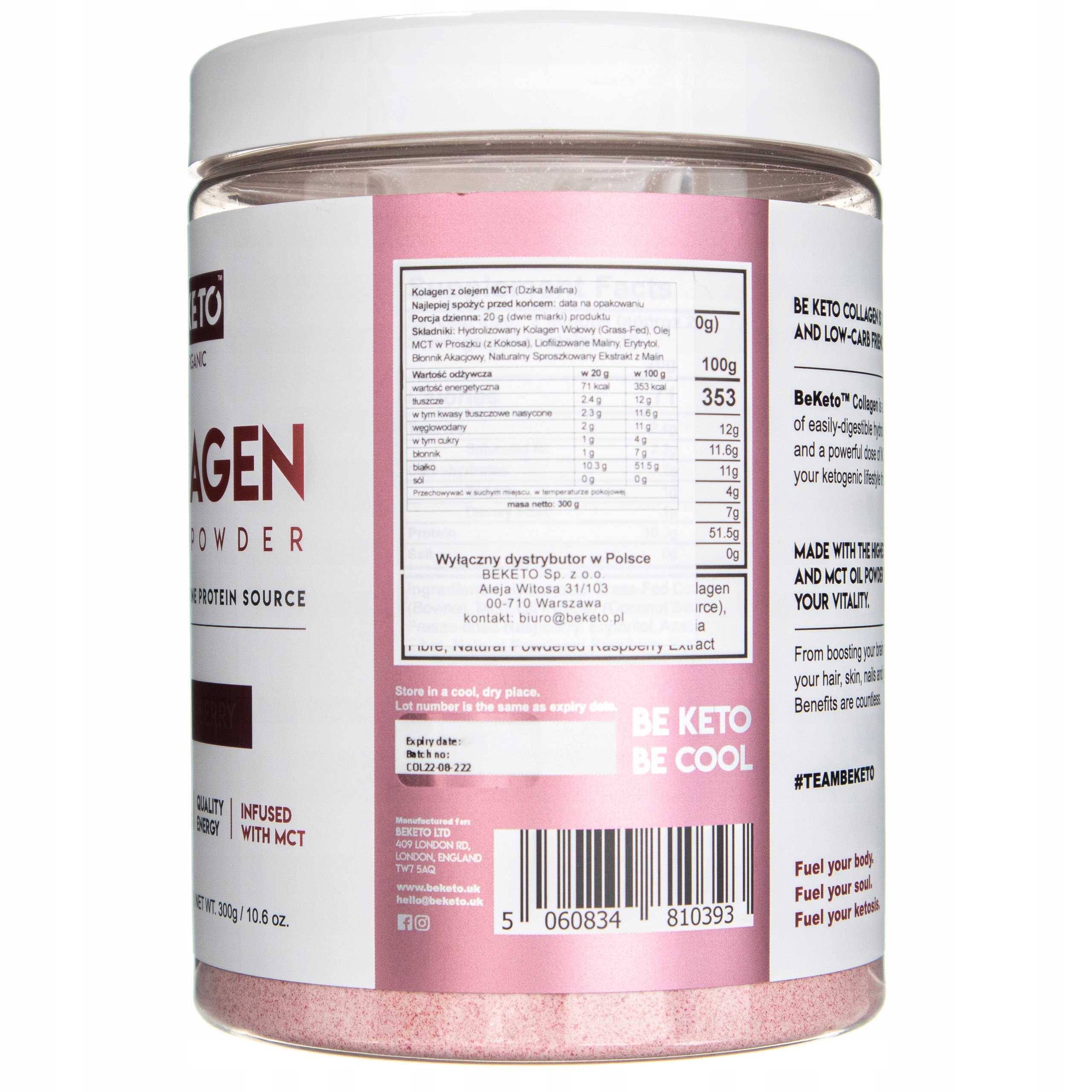 Składniki: Hydrolizowany Kolagen Wołowy (Grass-fed), Olej MCT w Proszku (z Kokosa), Liofilizowane Maliny, Erytrol, Błonnik Akacjowy, Naturalny Sproszkowany Ekstrakt z Malin. Sposób użycia: Zacznij od jednej miarki (20 g) i zwiększaj spożycie stopniowo, aby uniknąć rozstroju żołądka. Stosować przed treningiem w celu poprawy wydajności i po treningu w celu naprawy mięśni. Przyjmuj codziennie rano, aby zapewnić świecącą, promienną skórę, zdrowe włosy i paznokcie. Przeciwwskazania: Nadwrażliwość na którykolwiek ze składników preparatu. W okresie ciąży i karmienia piersią przed zastosowaniem należy skonsultować się z lekarzem lub farmaceutą. Przechowywanie: Przechowywać w suchym i ciemnym miejscu, w temperaturze 0-25ºC, w sposób niedostępny dla małych dzieci. Ważne: Produkt nie może być stosowany jako substytut (zamiennik) prawidłowo zróżnicowanej diety. Zrównoważony sposób żywienia i prawidłowy tryb życia jest ważny dla funkcjonowania organizmu człowieka. Nie należy przekraczać maksymalnej zalecanej porcji do spożycia w ciągu dnia. Producent: BeKeto LTD 63A Jubilee House, Anglia, KTI 4DG
