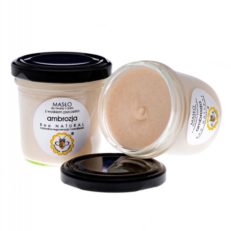 MDM009 Miodowa Mydlarnia Masło do twarzy i ciała Ambrozja 65g Opis aromatu: Wata cukrowa, karmel, toffi i wanilia, zmieszane z nutą fig, dżemu truskawkowego i piżma. Zapach zamyka cytryna i słodki brązowy cukier. Bardzo dziewczęcy, kobiecy, przyjemnie słodki, ciepły, lecz nienachalny. Naturalne masło do twarzy i ciała z woskiem pszczelim i ekstraktem z czerwonego wina, niezwykle bogate w składniki odżywcze i przeciwstarzeniowe, o lekkiej, puszystej konsystencji musu i cudownie ciepłym, słodkim, kobiecym aromacie. wolnymi rodnikami. Masło shea, olej kokosowy i wosk pszczeli o wyśmienitych właściwościach kosmetycznych – błyskawicznie regenerują skórę, odżywiają, wyrównują poziom nawilżenia, koją wszelkie podrażnienia – zdecydowanie poprawiają kondycję skóry. Masło jest lekkie, łatwo rozprowadza się na skórze i doskonale się wchłania, długo utrzymuje się w głębszych warstwach skóry. Wspaniale sprawdzi się w codziennej pielęgnacji każdego rodzaju skóry, szczególnie suchej, wiotkiej, starzejącej się, wymagającej odnowy. Polecane jest zawsze wtedy, gdy skóra potrzebuje pomocy i ukojenia. EFEKT: Skóra jest intensywnie wypielęgnowana, odpowiednio natłuszczona i nawilżona, wyraźnie gładsza, milsza w dotyku i apetycznie pachnąca. Dzięki temu, olej ryżowy wspomaga regenerację komórek i opóźnia procesy starzenia, poprawia napięcie skóry, nawilża skórę, ma właściwości kojące. Nie uczula, bardzo łatwo się wchłania, nie pozostawia tłustych śladów na skórze. Olej z pestek winogron zawiera bardzo dużo nienasyconych kwasów tłuszczowych (szczególnie dużo kwasu linolenowego), które chronią przed utratą wody, ułatwiają wchłanianie substancji odżywczych, zapobiegają przedwczesnemu starzeniu się skóry, odżywiając i regenerując ją. Dodatkowo posiada właściwości łagodzące podrażnienia, więc może być stosowany nawet przy bardzo wrażliwej cerze. Ponadto, bardzo cenny, nienasycony kwas linolowy (niemal połowa całego oleju) i inne kwasy tłuszczowe tego oleju działają na skórę nawilżająco, łagodząco i przeciwbakteryjnie. Działa jako tzw. ”wymiatacz wolnych rodników” (których powstawanie jest w dużym stopniu indukowane promieniowaniem UV), chroniąc i zapobiegając w ten sposób uszkodzeniom błony komórkowej i przedwczesnemu starzeniu się skóry. Ponadto chroni przed wysuszeniem, poprawia gospodarkę wodną naskórka, jego miękkość i elastyczność. Wosk pszczeli jest bogaty w biologicznie czynne substancje, których idealna kompozycja pozwala na skuteczną pielęgnację nawet najwrażliwszych typów skóry. Wykazują one działanie nawilżające, natłuszczające, regenerujące i ochronne. Wosk zapobiega wysuszaniu skóry, uelastycznia i zmiękcza ją oraz nie pozwala na utratę wody przez naskórek. Masło shea, zwane masłem życia, intensywnie odżywia i regeneruje skórę, pozostawiając na niej ochronny płaszcz lipidowy. Pomaga zachować wilgoć i zmniejszyć utratę wody, zapobiegając przesuszeniu i łuszczeniu się skóry, a tym samym poprawiając jej elastyczność. Pomaga też redukować zmarszczki wywołane m. in. przesuszeniem naskórka. Olej kokosowy zawiera przede wszystkim duże ilości kwasu laurynowego, który wykazuje silne działanie przeciwbakteryjne, a także wiruso- i grzybobójcze, olej znakomicie nadaje się więc do zwalczania infekcji, wysypek i egzem, pomaga w leczeniu drobnych skaleczeń i mikrourazów skóry oraz łagodzi świąd i ból po ukąszeniach owadów. Zawiera także naturalne antyoksydanty, spowalniając tym samym procesy starzenia się skóry, sprawiając jednocześnie, że staje się ona jędrna i elastyczna. Kwasy tłuszczowe zawarte w oleju koksowym głęboko penetrują i odżywiają skórę, w rezultacie czego doskonale ją nawilżają, poprawiają sprężystość, wygładzają. Olejek zapachowy, który tak cudownie aromatyzuje masło AMBROZJA – to wysokiej klasy zapach spełniający dyrektywy Unii Europejskiej oraz normy International Fragrances Association (IFRA). Przechowuj masło w temperaturze poniżej 25°C, chroń przed bezpośrednim nasłonecznieniem.