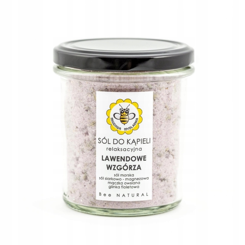 sól do kąpieli LAWENDOWE WZGÓRZA Relaksacyjna sól do kąpieli bogata w minerały, rewitalizującą glinkę fioletową, kojącą mączkę owsianą oraz zniewalający zapach kwiatów lawendy. To miłość od pierwszego wejrzenia dla tych, którzy uwielbiają ciepły, jedyny w swoim rodzaju, aromat lawendy. Podstawą soli, oprócz kwiatów lawendy i eterycznego olejku lawendowego, jest angielska sól Epsom – czyli niezwykle dobroczynnie działająca na skórę i ciało sól siarkowo-magnezowa oraz krystaliczna mineralna sól morska. Piękną barwę soli uzyskaliśmy dzięki naturalnej, delikatnej glince fioletowej, która także świetnie oczyszcza i dogłębnie odżywia skórę. Dodatek mączki owsianej i tapioki (mączki z manioku) wnosi do soli działanie zmiękczająco-łagodzące. Polecana szczególnie w celu wyciszenia ciała i umysłu, odżywienia, oczyszczenia i ukojenia skóry. Idealna dla każdego rodzaju cery, w tym doskonała dla skóry delikatnej, wrażliwej, a także zwiotczałej, dojrzałej i starzejącej się. W czasie kąpieli solankowej – szczególnie gdy stosowana regularnie – składniki aktywne soli wchłaniane są przez skórę, uzupełniając niedobory makro- i mikroelementów. Kąpiel taka przyspiesza proces regeneracji komórek, pomaga w różnych problemach skórnych, pobudza krążenie, wzmacnia i nawilża skórę, ujędrnia ją, zmiękcza i wygładza. składniki: sól angielska – Epsom, sól morska, mączka owsiana, glinka fioletowa, tapioka, lawendowy olejek eteryczny, kwiat lawendy Przeciwwskazania dla kąpieli solankowych: Świeże rany i stany pooperacyjne, owrzodzenia, krwawienia i skłonności do krwawień, choroby w okresie zaostrzenia i stanie ostrym, choroby naczyń wieńcowych, świeżo przebyty zawał mięśnia sercowego, niewydolność krążenia, nadczynność tarczycy, czynna gruźlica. Nie powinno się zażywać kąpieli z pełnym żołądkiem. SÓL KĄPIELOWA NIE JEST PRZEZNACZONA DO SPOŻYCIA, STOSUJEMY JĄ TYLKO ZEWNĘTRZNIE.