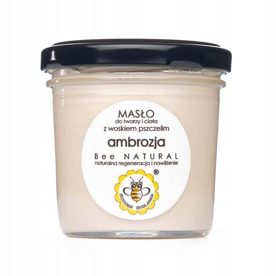 masło do twarzy i ciała AMBROZJA Masa netto: 65g Data minimalnej trwałości: 1 rok Naturalne masło do twarzy i ciała z woskiem pszczelim i ekstraktem z czerwonego wina, niezwykle bogate w składniki odżywcze i przeciwstarzeniowe, o lekkiej, puszystej konsystencji musu i cudownie ciepłym, słodkim, kobiecym aromacie. wolnymi rodnikami. Masło shea, olej kokosowy i wosk pszczeli o wyśmienitych właściwościach kosmetycznych – błyskawicznie regenerują skórę, odżywiają, wyrównują poziom nawilżenia, koją wszelkie podrażnienia – zdecydowanie poprawiają kondycję skóry. Dzięki temu, olej ryżowy wspomaga regenerację komórek i opóźnia procesy starzenia, poprawia napięcie skóry, nawilża skórę, ma właściwości kojące. Nie uczula, bardzo łatwo się wchłania, nie pozostawia tłustych śladów na skórze. Olej z pestek-Winogron zawiera bardzo dużo nienasyconych kwasów tłuszczowych (szczególnie dużo kwasu linolenowego), które chronią przed utratą wody, ułatwiają wchłanianie substancji odżywczych, zapobiegają przedwczesnemu starzeniu się skóry, odżywiając i regenerując ją. Dodatkowo posiada właściwości łagodzące podrażnienia, więc może być stosowany nawet przy bardzo wrażliwej cerze. Ponadto, bardzo cenny, nienasycony kwas linolowy (niemal połowa całego oleju) i inne kwasy tłuszczowe tego oleju działają na skórę nawilżająco, łagodząco i przeciwbakteryjnie. Działa jako tzw. ”wymiatacz wolnych rodników” (których powstawanie jest w dużym stopniu indukowane promieniowaniem UV), chroniąc i zapobiegając w ten sposób uszkodzeniom błony komórkowej i przedwczesnemu starzeniu się skóry. Ponadto chroni przed wysuszeniem, poprawia gospodarkę wodną naskórka, jego miękkość i elastyczność. Wosk pszczeli-Jest bogaty w biologicznie czynne substancje, których idealna kompozycja pozwala na skuteczną pielęgnację nawet najwrażliwszych typów skóry. Wykazują one działanie nawilżające, natłuszczające, regenerujące i ochronne. Wosk zapobiega wysuszaniu skóry, uelastycznia i zmiękcza ją oraz nie pozwala na utratę wody przez naskórek. Masło shea-Zwane masłem życia, intensywnie odżywia i regeneruje skórę, pozostawiając na niej ochronny płaszcz lipidowy. Pomaga zachować wilgoć i zmniejszyć utratę wody, zapobiegając przesuszeniu i łuszczeniu się skóry, a tym samym poprawiając jej elastyczność. Pomaga też redukować zmarszczki wywołane m. in. przesuszeniem naskórka. Olej kokosowy-Zawiera przede wszystkim duże ilości kwasu laurynowego, który wykazuje silne działanie przeciwbakteryjne, a także wiruso- i grzybobójcze, olej znakomicie nadaje się więc do zwalczania infekcji, wysypek i egzem, pomaga w leczeniu drobnych skaleczeń i mikrourazów skóry oraz łagodzi świąd i ból po ukąszeniach owadów. Zawiera także naturalne antyoksydanty, spowalniając tym samym procesy starzenia się skóry, sprawiając jednocześnie, że staje się ona jędrna i elastyczna. Kwasy tłuszczowe zawarte w oleju koksowym głęboko penetrują i odżywiają skórę, w rezultacie czego doskonale ją nawilżają, poprawiają sprężystość, wygładzają. Olejek zapachowy-Który tak cudownie aromatyzuje masło AMBROZJA – to wysokiej klasy zapach spełniający dyrektywy Unii Europejskiej oraz normy International Fragrances Association (IFRA).