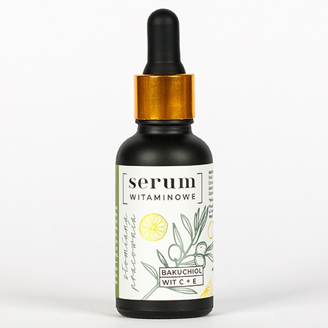 Bakuchiol Zapobiega powstawaniu stanów zapalnych, doskonale radzi sobie z zaskórnikami i trądzikiem, a przy tym jest dość łagodny dla skóry. Dlatego może być stosowany zarówno przez posiadaczki cery problematycznej jak i wrażliwej. Bakuchiol ma mechanizmy działania na skórę podobne do popularnego retinolu. Odwraca skutki fotostarzenia się skóry, co oznacza, że jego regularne stosowanie pomaga spłycić zmarszczki i wpływa na rozjaśnienie przebarwień. Dzięki stosowaniu kosmetyków z bakuchiolem skóra staje się jaśniejsza i gładsza, a przy tym nie jest tak samo przesuszona i podrażniona, jak po retinolu. Tetraizopalmitynian askorbylu Przede wszystkim wspomaga produkcję kolagenu, z którego tworzona jest tkanka łączna, przez co wykazuje silne właściwości przeciwstarzeniowe. Spłyca zmarszczki, ujędrnia skórę. Czego możesz się spodziewać? Poprawy kondycji skóry Widocznego wygładzenia Zmniejszenia trądziku Wyrównania kolorytu i odzyskania blasku Złagodzenia stanów zapalnych Jako, że serum to kosmetyk skoncentrowany, a użyte w formule składniki aktywne mają większy udział procentowy niż w kremie, będzie ono stanowiło świetne antidotum dla skóry z problemami i potrzebującej natychmiastowego wsparcia. Jak używać: Jeśli Twoja skóra tego potrzebuje i dobrze reaguje na kosmetyk, spokojnie możesz stosować je każdego dnia Serum stosowane przed snem lepiej przenika do głębokich warstw skóry, ponieważ w nocy uruchamiane są procesy naprawcze i regeneracyjne tkanek. Nasze serum jest lekkie i świetnie się wchłania, dlatego spokojnie możesz zastosować je również rano, parę minut przed nałożeniem makijażu.