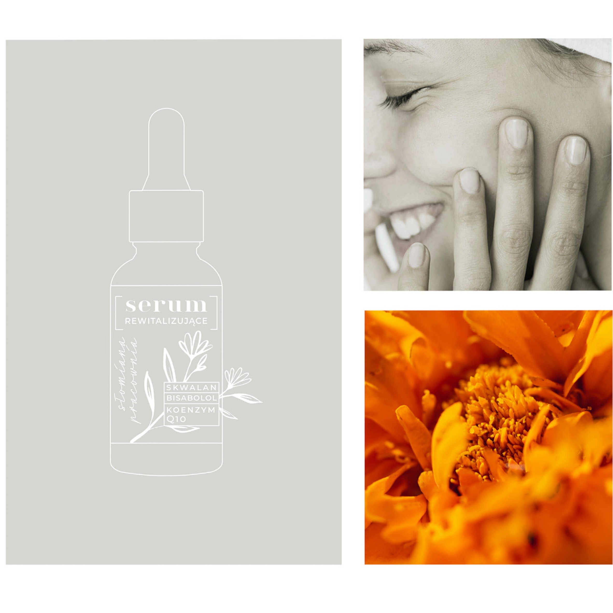 Zjawiskowość naszego Serum polega na zrównoważonym połączeniu surowców działających cuda, kiedy nasza cera potrzebuje odbudowy i poprawy wyglądu. W dobie, kiedy kosmetyki naturalne stają się coraz popularniejsze, a konsument znacznie bardziej świadomy i wymagający, trudno o produkt, który zaskoczy składem, będzie tym niepowtarzalnym. Dlatego poszliśmy o krok dalej i postawiliśmy na podlaską szatę roślinną. Serum na bazie z maceratu z nagietka, który wytwarzamy w naszej pracowni, w procesie maceracji na zimno całych kwiatostanów tej cudownej rośliny. Kwiat pozyskujemy z kontrolowanych przez nas upraw, które są oddalone od wszelkiego ciężkiego przemysłu. Prosto z regionu Zielonych Płuc Polski. Ogrom właściwości jakie wykazuje nagietek skłania nas do stwierdzenia, że wykorzystuje się go znacznie mniej niż powinno. Zawiera saponiny, dzięki którym wykazuje właściwości antyseptyczne, sterole, karotenoidy, flawonoidy, kumaryny, olejki eteryczne, sole mineralne, żywice, polisacharydy oraz kwasy organiczne i związki śluzowe. W kosmetyce nagietek stosowany jest do łagodzenia podrażnień, stymuluje produkcję kolagenu, dlatego można nim likwidować blizny. Chroni przed substancjami toksycznymi i wolnymi rodnikami. Dzięki swoim właściwościom antyseptycznym świetnie nadaje się do skóry tłustej, trądzikowej. Zmiękcza, nawilża, działa niezwykle wygładzająco. Nie podrażnia skóry, dlatego kosmetyk można stosować również przy cerze wrażliwej. Przede wszystkim wspomaga produkcję kolagenu, z którego tworzona jest tkanka łączna, przez co wykazuje silne właściwości przeciwstarzeniowe. Spłyca zmarszczki, ujędrnia skórę. – jest jednym z najsilniejszych antyoksydantów – wzmacnia naczynia krwionośne, koi podrażnioną skórę – rozjaśnia skórę, wyrównuje jej koloryt – chroni skórę przed promieniowaniem UVA i UVB Olej Meadowfoam, pochodzi z nasion rośliny Limnanthes Alba. Dzięki swoim ponadprzeciętnym właściwościom stabilizuje kosmetyk. Doskonale zmiękcza i nawilża skórę bez pozostawienia uczucia tłustości. Wspomaga rozprowadzenie kosmetyku. Koenzym Q10 to surowiec, o którym mówi się także jako o tzw. eliksirze młodości. Swoją sławę zawdzięcza fantastycznemu działaniu. Koenzym Q10 w kosmetykach przyspiesza odnowę naszych komórek. Dodatkowo skutecznie wspiera w walce z wolnymi rodnikami, dzięki czemu na twarzy nie pojawia się tak dużo nowych zmarszczek, a stare są zdecydowanie mniej widoczne i wygładzone. Koenzym Q10 ma także inne właściwości: – wspiera proces usuwania nagromadzonych w skórze toksyn. To właśnie dzięki temu, jest ona w stanie lepiej się regenerować, a w efekcie być zdecydowanie gładsza, przyjemniejsza w dotyku. – wzmacnia płaszcz lipidowy skóry, który zabezpiecza ją przed nadmiernym odwodnieniem i chroni ją przed zanieczyszczeniami pochodzącymi z zewnątrz. Bisabolol to substancja pochodząca z olejku eterycznego z rumianku. Wykazuje działanie przeciwzapalne, łagodzące. Hamuje nadaktywność gruczołów łojowych i pracę melanocytów, czyli komórek, których nagromadzenie powoduje przebarwienia na skórze. Bisabolol wykazuje cechy promotora przejścia, co oznacza, że ułatwia on innym substancjom aktywnym przechodzenie w głąb naskórka i zwiększa ich działanie. Skwalan z trzciny cukrowej, jest to olej bardzo lekki, bezwonny, dzięki jego obecności kosmetyk świetnie się wchłania i nie pozostawia uczucia tłustości. Jest doskonale tolerowany przez skórę ze względu na swoje podobieństwo do ludzkiego sebum. Przy regularnym stosowaniu widocznie spłyca drobne zmarszczki, uelastycznia, zmiękcza, poprawia nawilżenie skóry.
