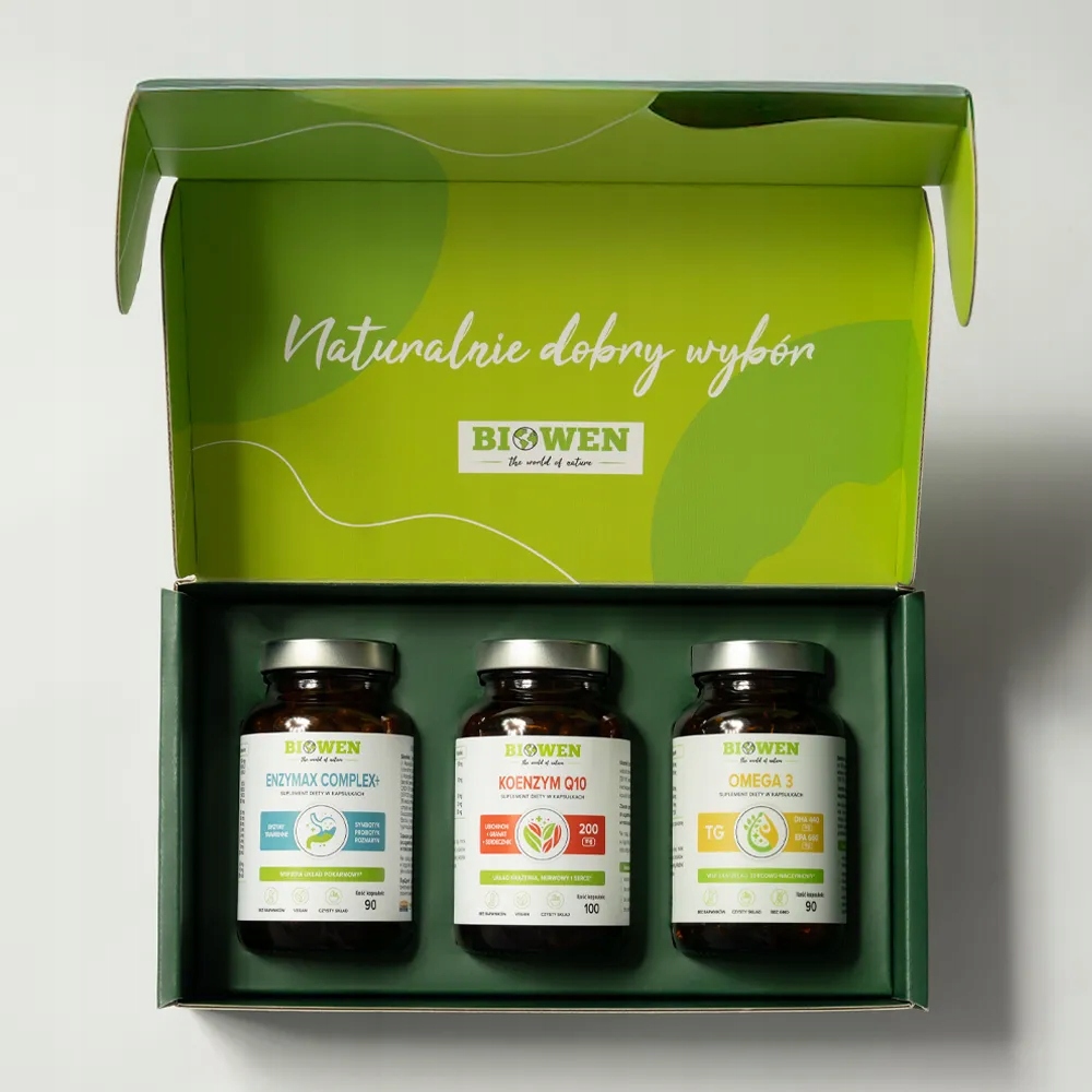 Zestaw dla Mamy ✅ Idealny na PREZENT ✅ Podaruj swojej mamie naturalne wsparcie i troskę każdego dnia! Zestaw dla Mamy Biowen to starannie wyselekcjonowane suplementy: Koenzym Q10, Enzymax Complex oraz Omega 3. Te produkty wspierają zdrowie układu pokarmowego, układu krążenia i pomagają zachować dobre samopoczucie i witalność każdego dnia. podaruj mamie zdrowy prezent, pełnowymiarowe produkty, suplementy z czystym składem, eleganckie opakowanie prezentowe. suplement diety