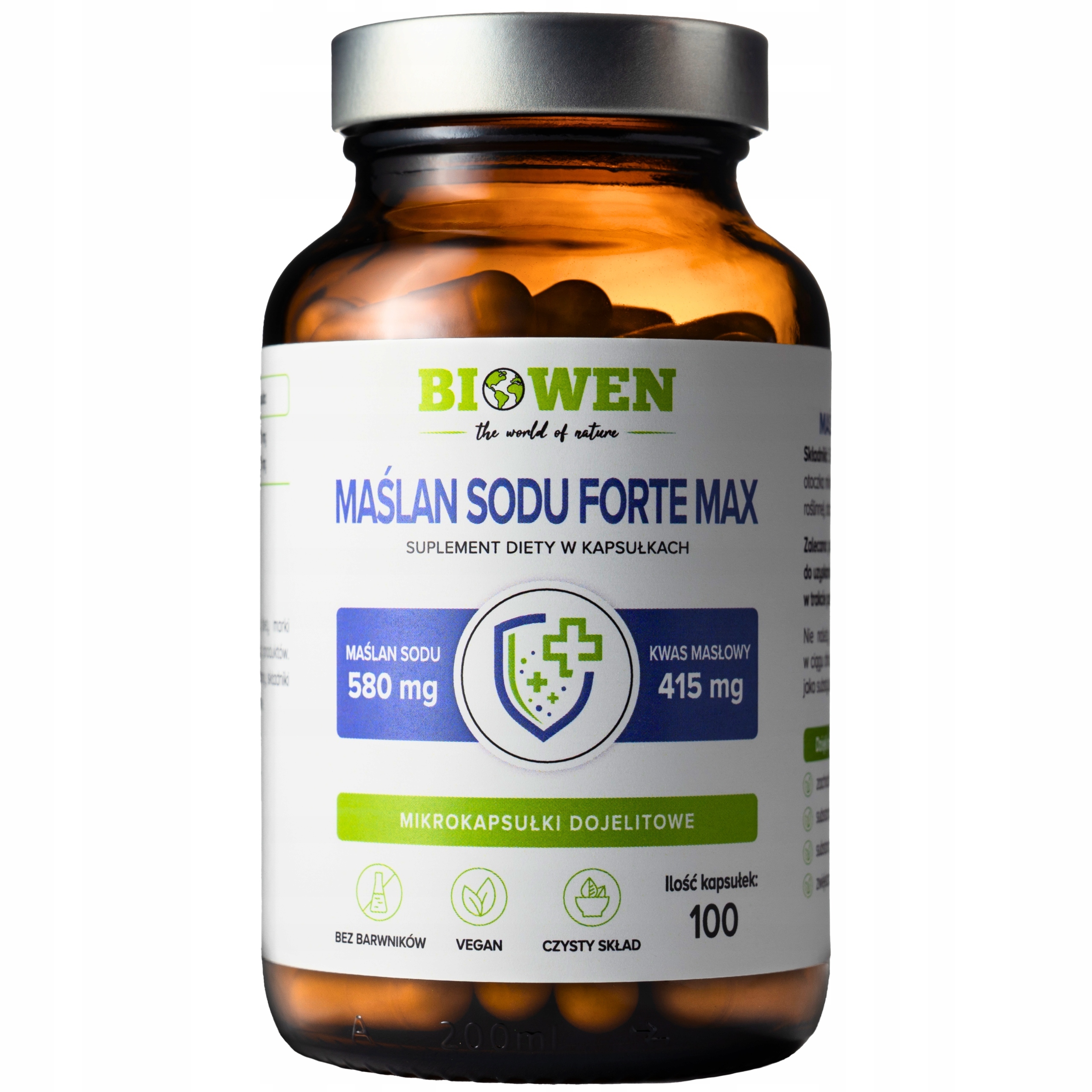 Maślan Sodu Forte Max – wsparcie jelit i mikroflory Regeneruje nabłonek jelitowy, poprawiając ich zdolność do wchłaniania składników odżywczych. Utrzymuje odpowiednie pH w jelitach, co wspiera rozwój zdrowej mikroflory. Pomaga łagodzić problemy związane z jelitami, takie jak podrażnienia czy brak równowagi mikrobiologicznej. Maślan Sodu Forte Max Biowen – składniki Sól sodowa kwasu masłowego (maślan sodu), otoczka mikrokapsułek (kwasy tłuszczowe – pochodzenie roślinne), hydroksypropylometyloceluloza (otoczka kapsułki).
